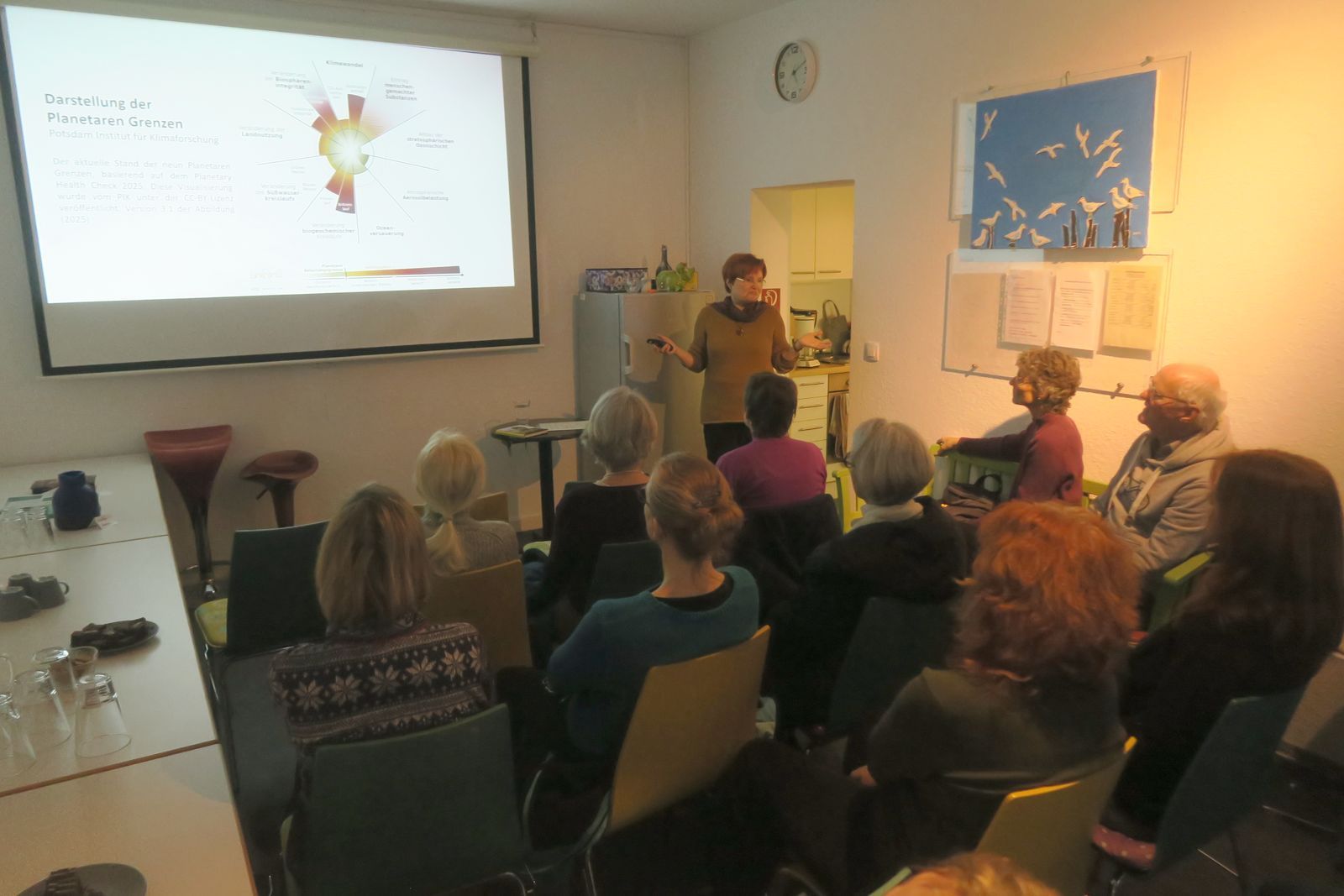 So konnten die Interessierten die Darstellung der Planetaren Grenzen einigermaßen gefasst aufnehmen, in der aufgezeigt ist, dass sieben der vom PIK definierten neun Planetaren Grenzen schon deutlich bis hochriskant überschritten sind. Nach einem Ausflug in die Evolutionsbiologie, die erklärt, warum negative Nachrichten direkt in unser Hirn gehen, die positiven Reaktionen darauf aber mühsam gelernt werden müssen, ging es an das, was uns Hoffnung gibt.