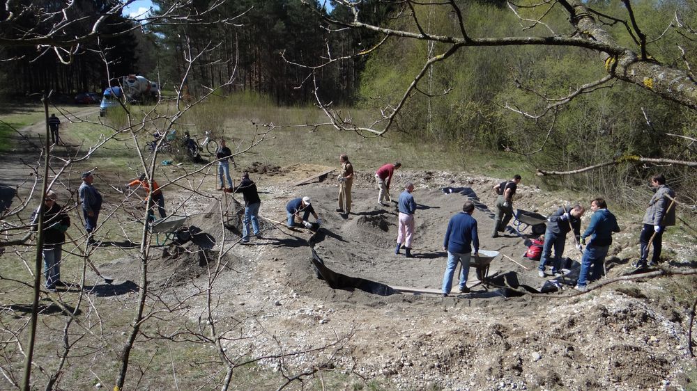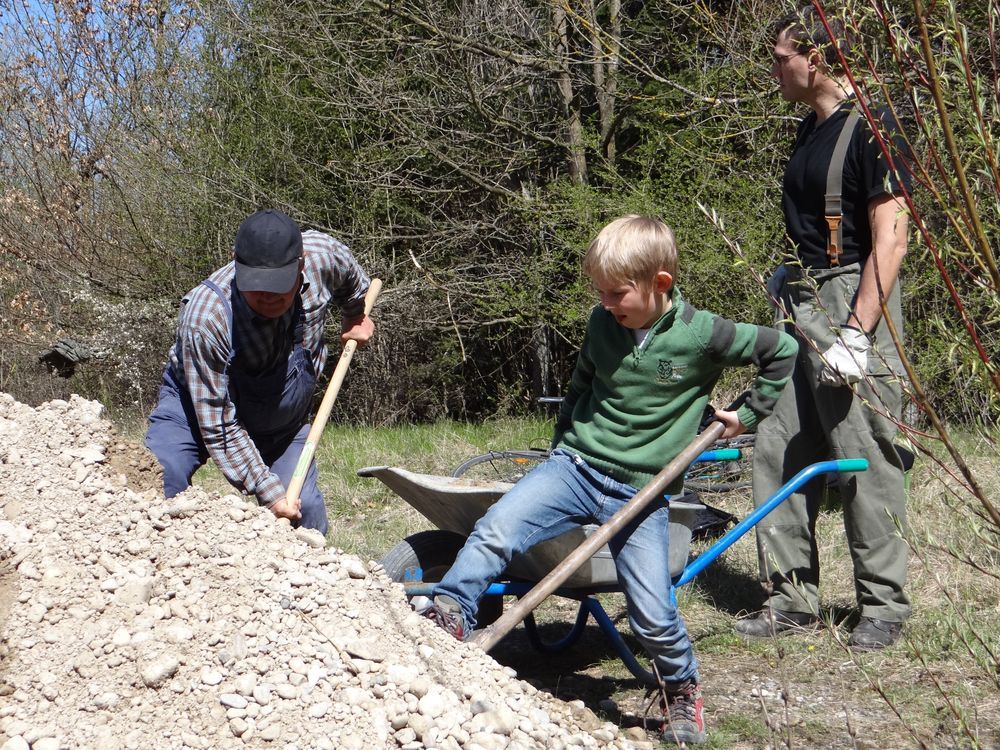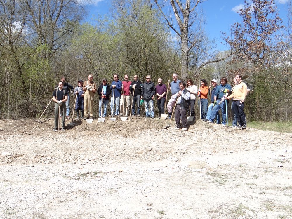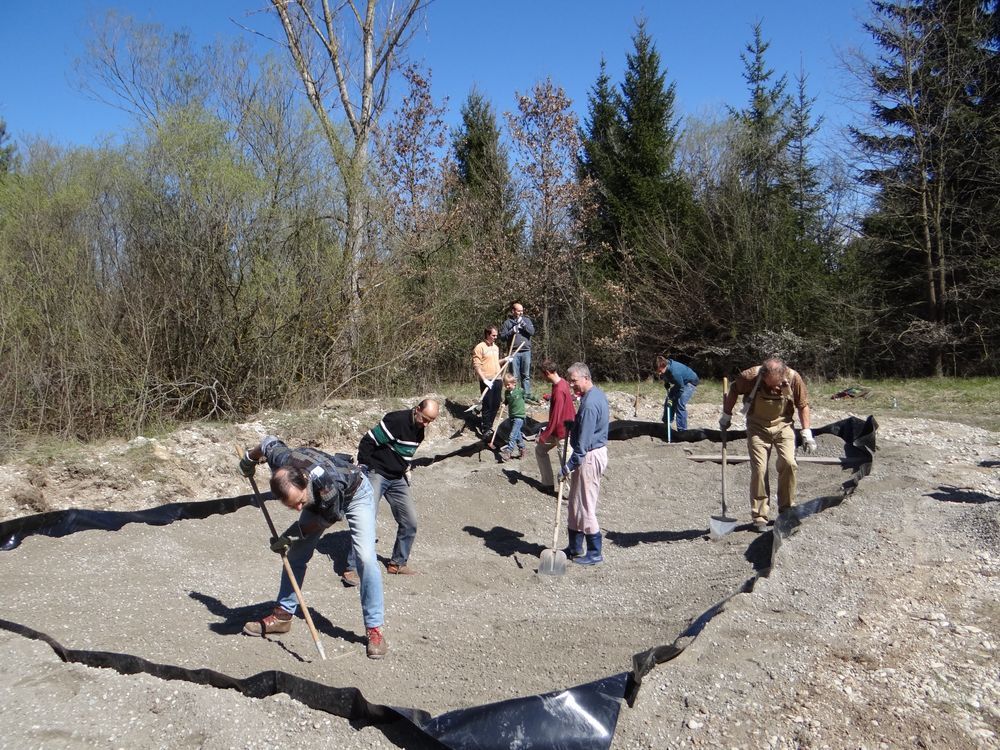 Bei strahlendem Wetter, packten rund 20 Helfer aus Ober- und Unterschleißheim an und schaufelten, was die Schotterebene südlich vom Flugplatz Oberschleißheim hergab. Die Gemeinde Oberschleißheim steuerte fertig gemischten Magerbeton bei, der die Teichsohle etwas stabilisiert.