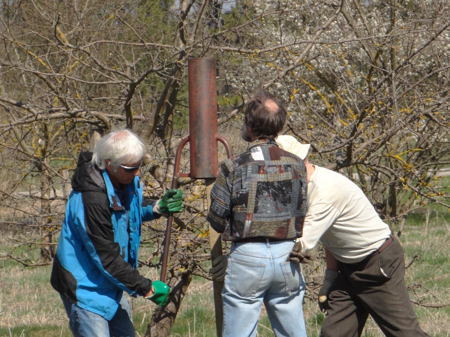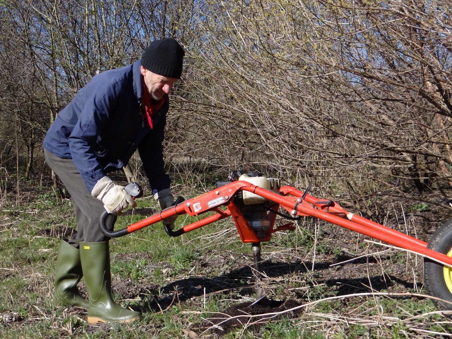 Innerhalb von zehn bis zwanzig Jahren würde die Fläche von selbst weiter verbuschen, doch um den Vorgang zu beschleunigen mussten hier rund 300 Jungpflanzen gesetzt werden. Mit einem Erdbohrer bohrten ein paar kräftige Männer Pflanzlöcher. Nach Anleitung des ehemaligen Revierförsters Alex Riedlbauch wurden die Pflanzen von den Helfer fachmännisch gesetzt. Die größeren Gehölze bekamen Stützpfähle. Zum Schluss wurde "gezwirbelt", und zwar Heidschnuckenwolle um die Triebspitzen und Seitenäste der jungen Gehölze. Diese intensiv riechende (stinkende?) Wolle verdirbt hungrigen Rehen und Hasen den Appetit und lässt aus kleinen Setzlingen mit etwas Glück prächtige Pflanzen werden. Ein Tipp von Försterin Maria Reuther, die auch die Pflanzen und die Wolle besorgte.