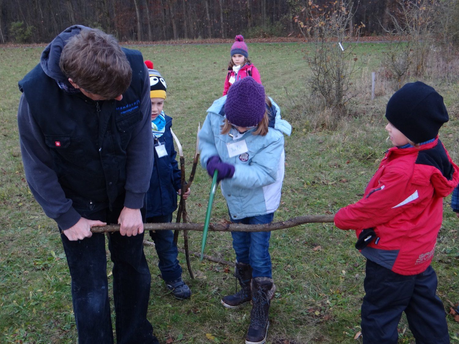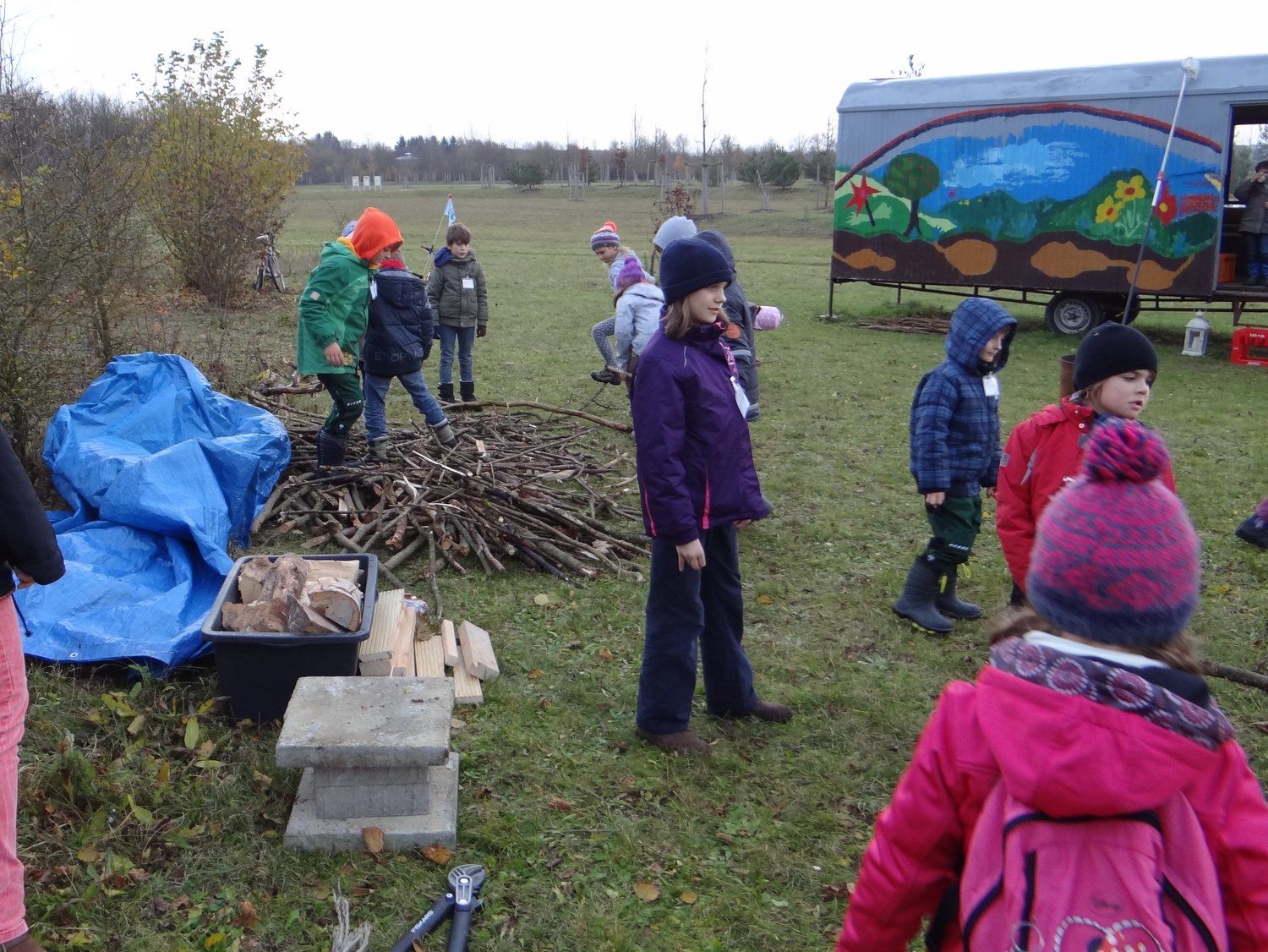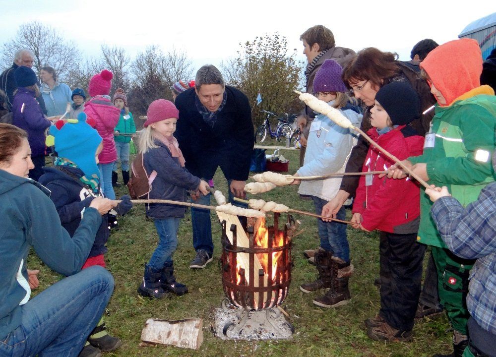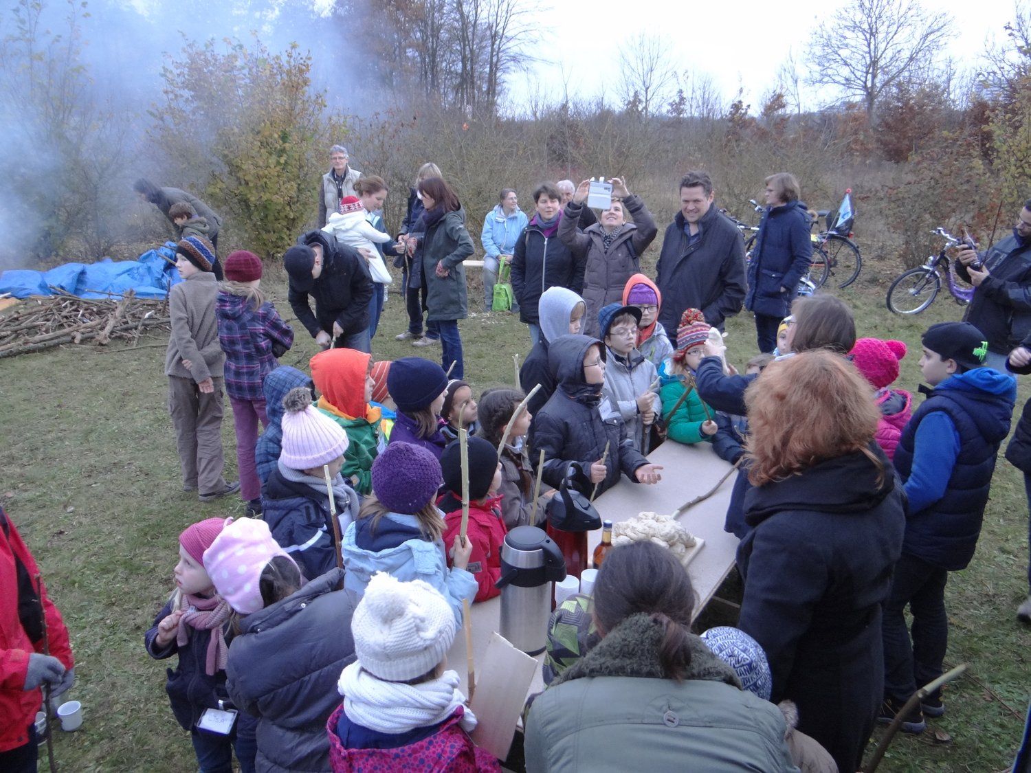 15.11.2014 - Lecker: Beim Herbstfest am Bauwagen haben wir Stockbrot gebacken. Aber erst einmal brauchten wir Brennholz aus dem Berglwald und mussten es mit allerlei Tricks und Sägen zerkleinern. In der frühen Abenddämmerung kamen dann auch noch die Eltern dazu - und sogar unser Erster Bürgermeister Christoph Böck.