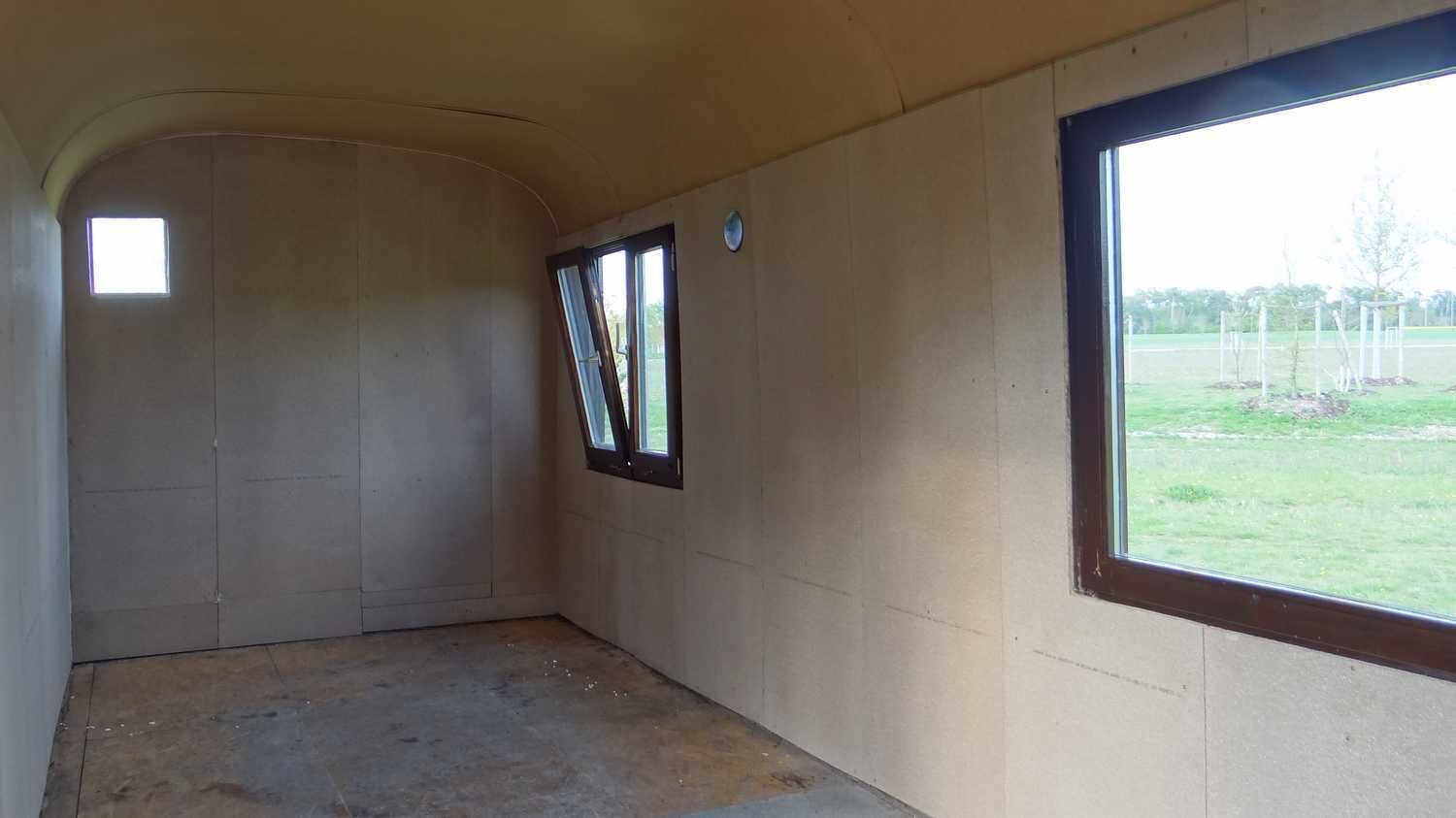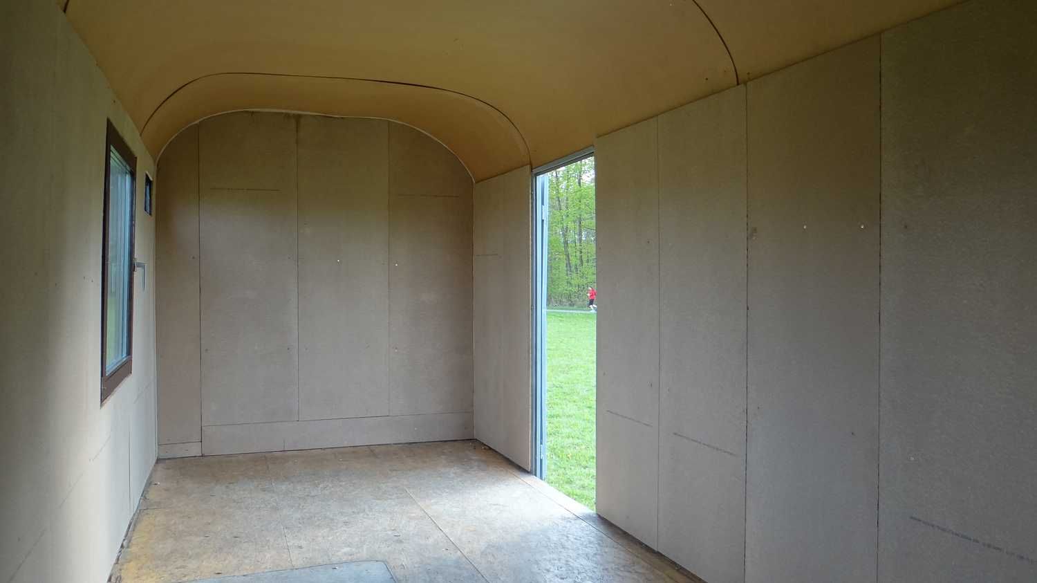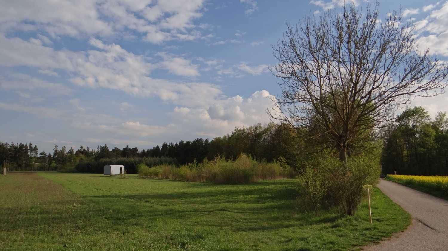 23.04.2014 - Ein ungewohnter Anblick empfängt Spaziergänger seit Mitte April vor dem Berglwald. Unsere Kindergruppe hat auf einer der Ausgleichsflächen einen alten Bauwagen bezogen. Genaugenommen, steht er dort vorerst nur, denn er ist noch völlig leer, aber in gutem Zustand. Er wurde von Jugendlichen aus Erdweg bei Dachau als Treff ausgebaut, aber kaum genutzt. Für uns gibt es also kaum etwas zu reparieren - nur zu verschönern, was nach und nach gemeinsam mit den Kindern geschehen soll.