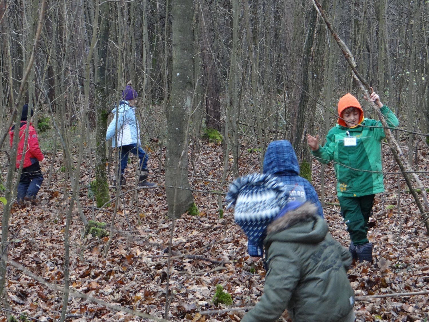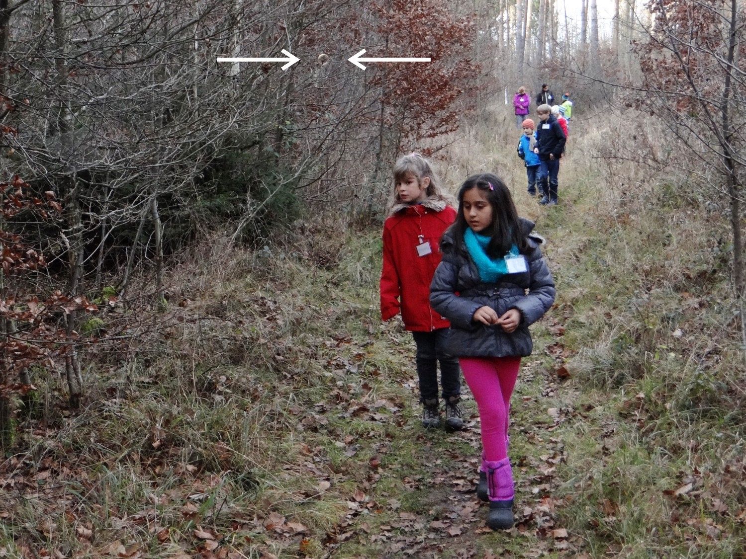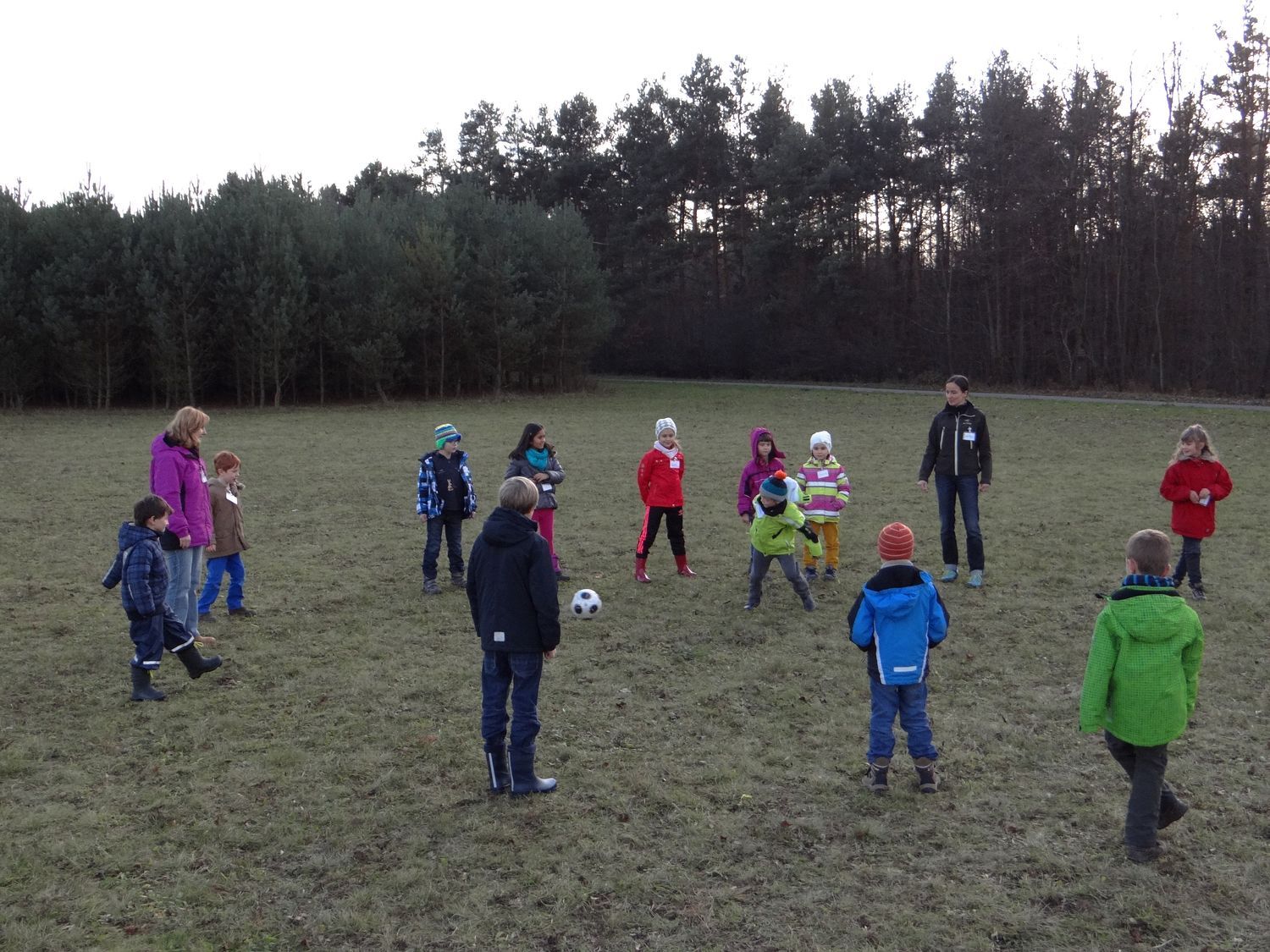 13.12.2014 - Sonne und Wärme im Dezember, was liegt da näher als eine Runde "Hüpf, kleiner Floh". Danach gings in den Wald. Dass man dort oft keine Tiere sieht, liegt nicht nur an deren Scheu. Ob Erdkröte, Frosch oder Blindschleiche: Die meisten Tiere sind so gut getarnt, dass man sie nur sehr schwer erkennen kann. Wer mehr entdecken will, muss seinen Blick schulen, zum Beispiel mit einem Suchspiel: Entlang eines Weges waren viele kleine und größere, auffällige und unauffällige Gegenstände versteckt: vom gelben Bauhelm über ein schwarzes Verlängerungskabel und eine Klebebandrolle bis hin zu einem durchsichtigen Plexiglasstück. Wer dann erfährt, dass es viel viel mehr Sachen sind, als nach dem ersten Durchgang vermutet, schaut beim zweiten nochmal so genau hin. Zur Brotzeit haben wir noch den neuen Ofen eingeheizt.
