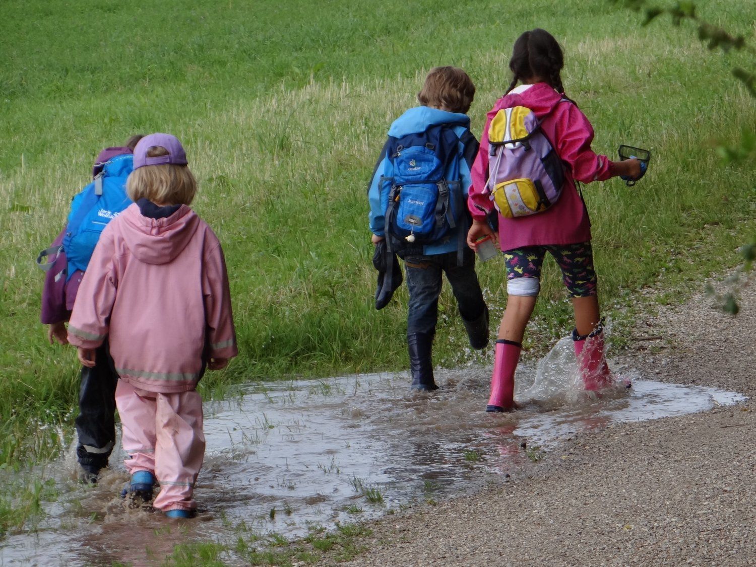 12.07.2014 - Wenn der Sommer nass ist, macht Wasser nochmal so viel Spaß, zum Beispiel mit Gummistiefeln im Bachbett. Bei unseren Forschungen unter den Steinen entdeckten wir allerhand Getier wie Bachflohkrebse, Wasserläufer und Eintagsfliegenlarven. Aus verhakelten Ahornblättern bauten wir Flöße, um sie auf einen gefährlichen Weg durch den Dschungel zu schicken. Riesige Pfützen am Wegrand machten auch den Heimweg zu einem nassen Vergnügen.