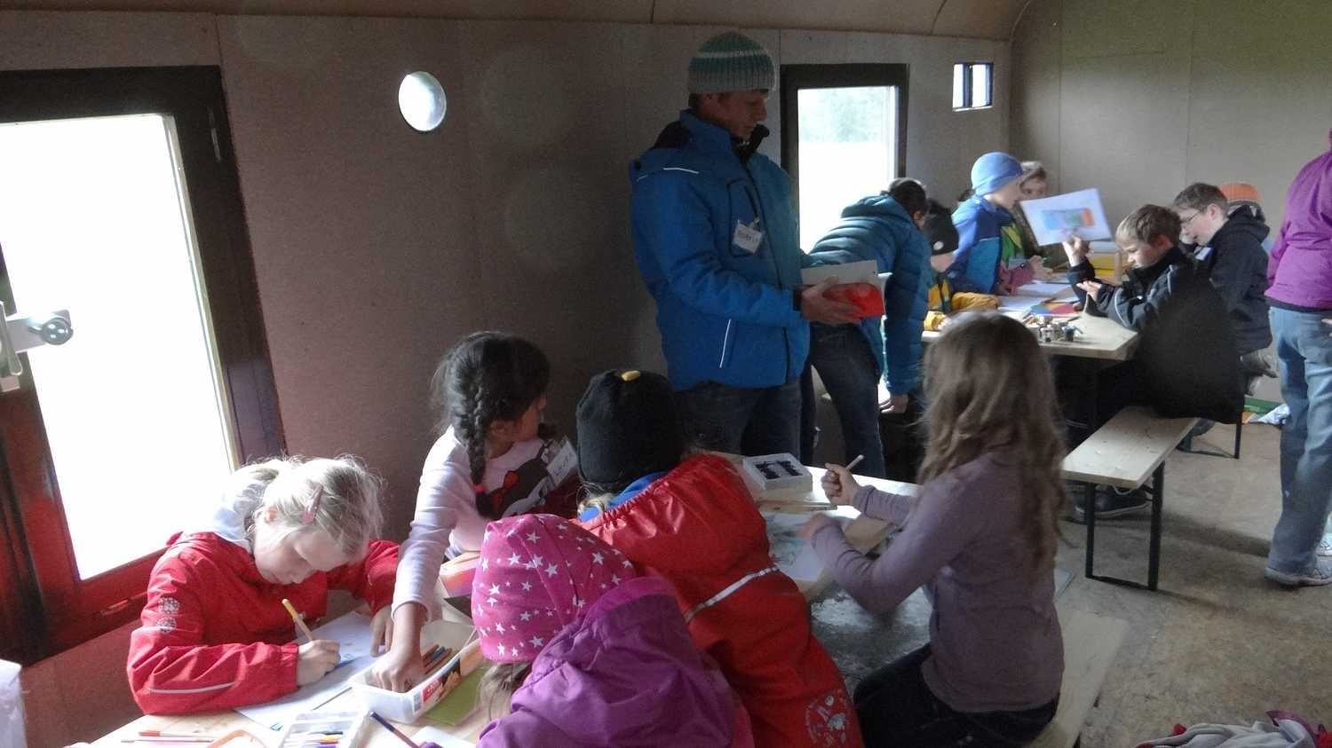 Zur gleichen Zeit machte sich die andere Häfte der Gruppe im trockenen Bauwagen daran, Ideen für dessen Bemalung zu zeichnen. Dabei kamen erstaunliche Entwürfe zustande, die wir beim nächsten Treffen mit den Kindern umsetzen werden. Nach der Halbzeit wechselten beide Gruppen.