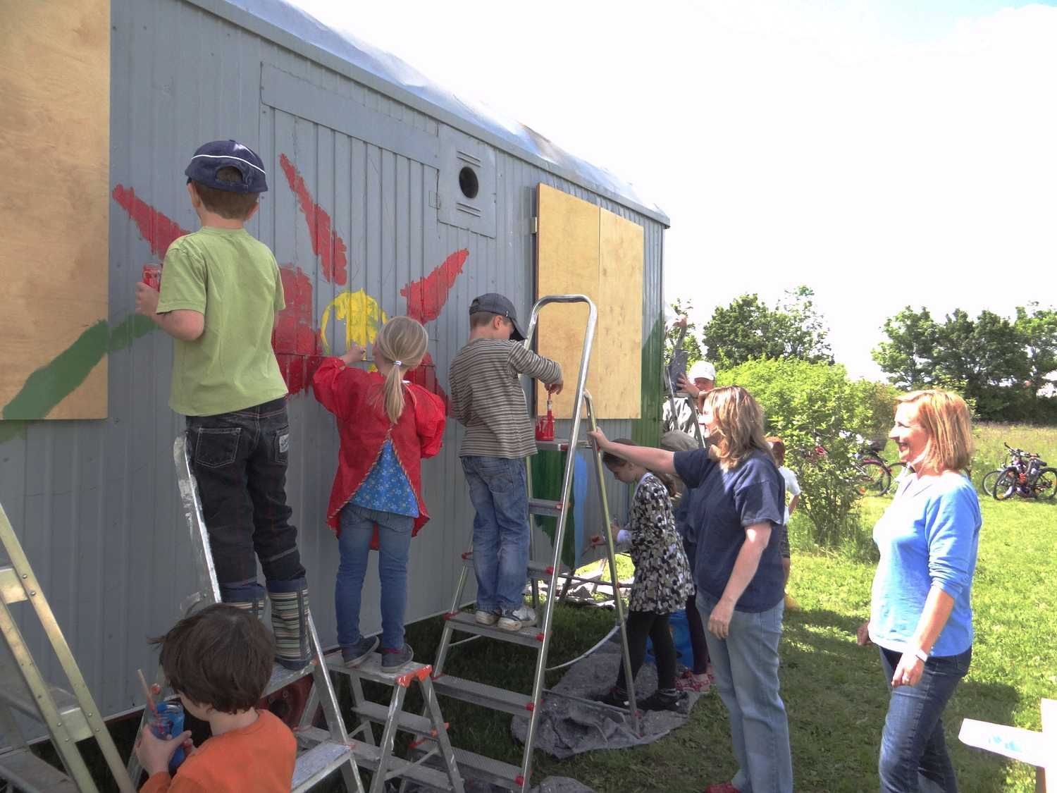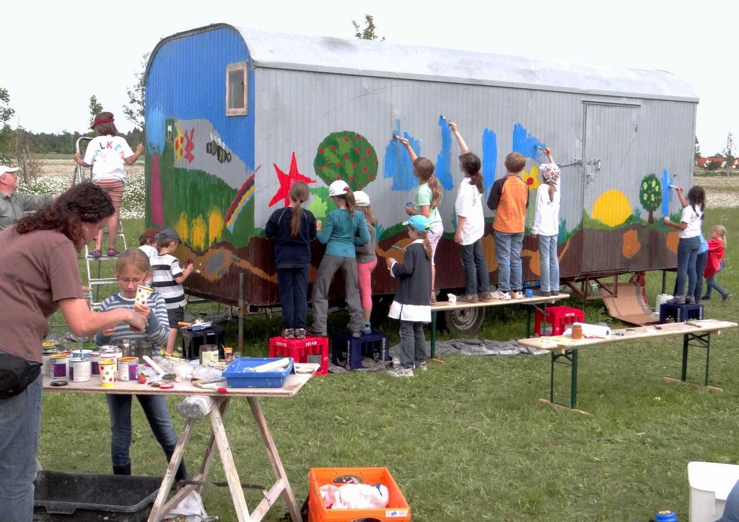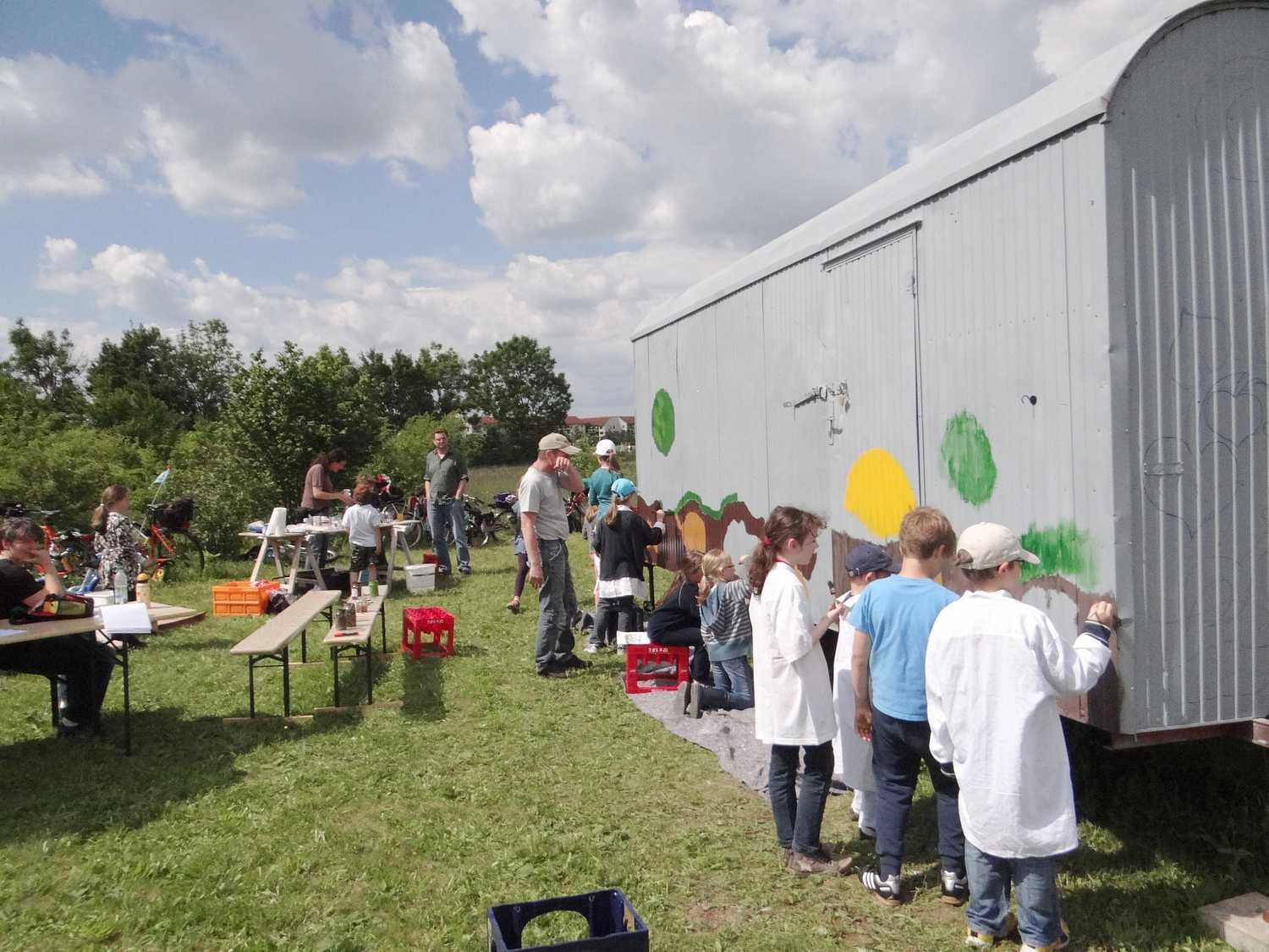 09.06.2014 - Bei zwei Malaktionen in den Pfingstferien haben wir unseren Bauwagen verschönert. Vorlage waren Entwürfe, die die Kinder bei einem früheren Treffen gezeichnet hatten, aber auch die üppig sprießende Natur selbst: Margeriten, Wiesensalbei, Klappertopf und Esparsette lieferten den prachtvollen Hintergrund.