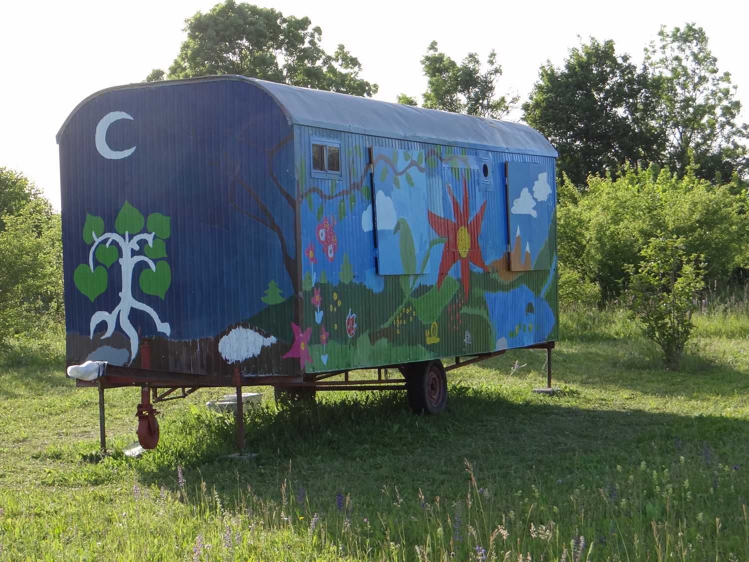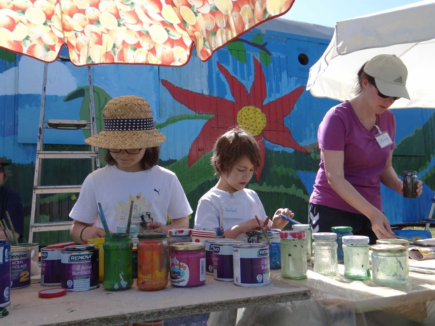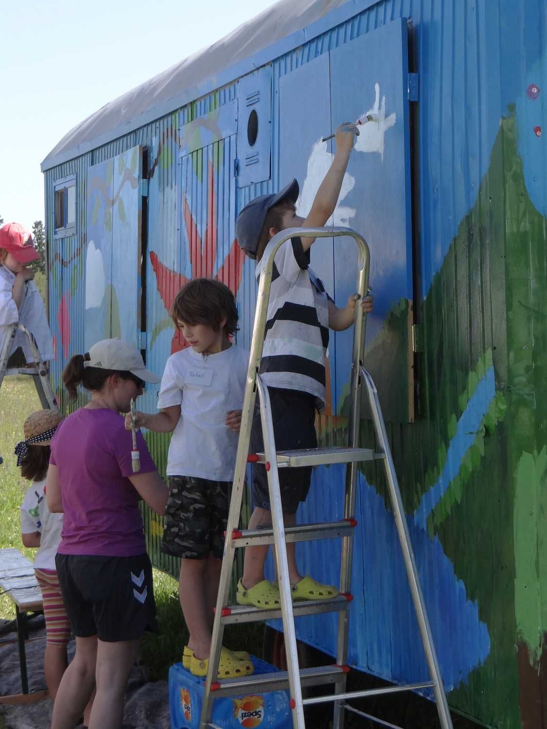 09.06.2014 - Bei zwei Malaktionen in den Pfingstferien haben wir unseren Bauwagen verschönert. Vorlage waren Entwürfe, die die Kinder bei einem früheren Treffen gezeichnet hatten, aber auch die üppig sprießende Natur selbst: Margeriten, Wiesensalbei, Klappertopf und Esparsette lieferten den prachtvollen Hintergrund.