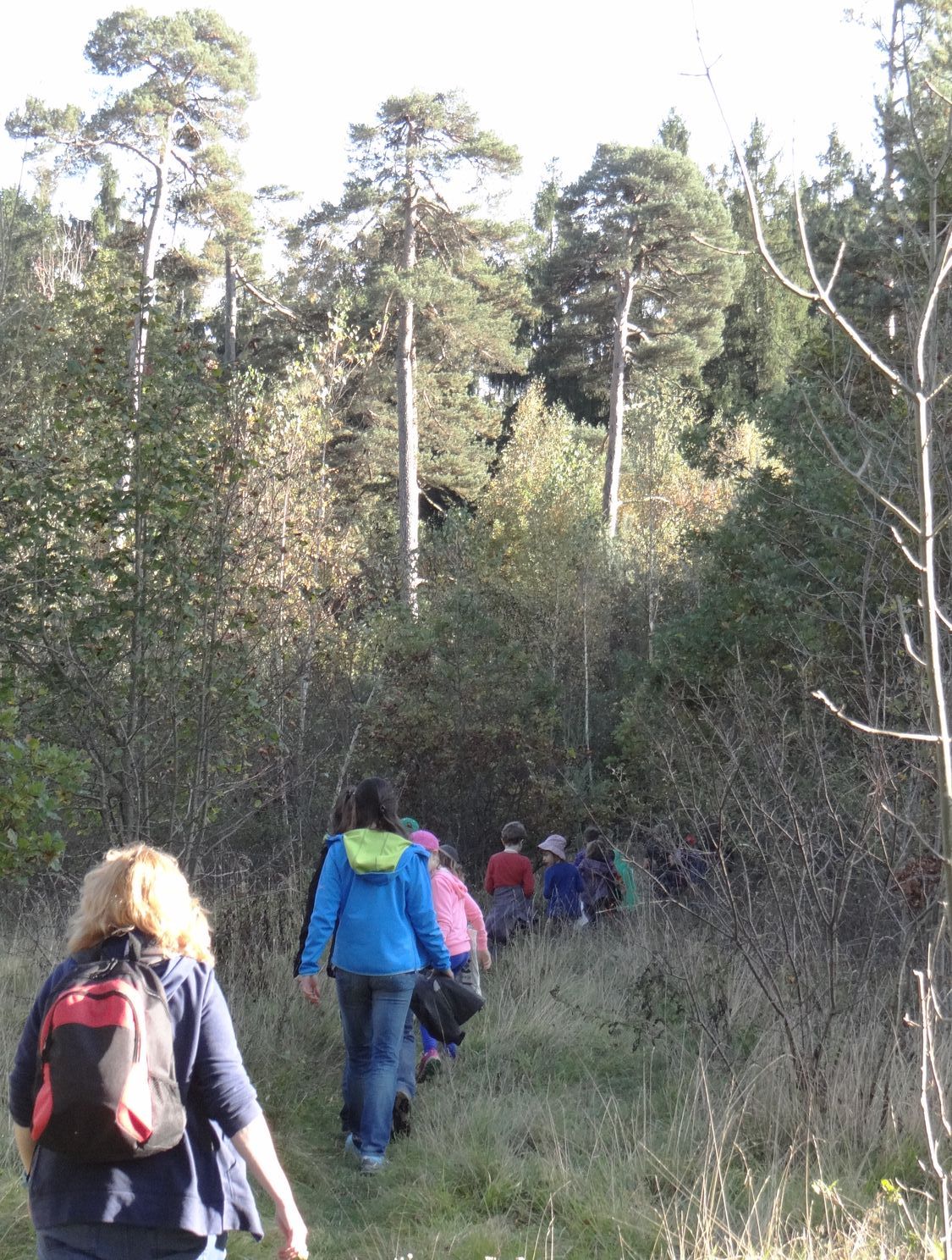 18.10.2014 - Letzte Woche wurden die großen Wiesen gemäht. Jetzt ist auch wieder Platz zum Toben. Beim Eulen-und-Krähen-Spiel und bei der Fuchsjagd kamen alle aus der Puste. Danach gab es manches über den Altweibersommer und seine Spinnen zu erfahren. Der Ausflug in den Berglwald führte auch am "Bogenbaum" vorbei. Die Esche war vor zehn Jahren vom Schnee umgebogen worden. Die Förster hatten sie aber stehen gelassen. Aus dem zersplitterten Stamm sind inzwischen mehrere neue hervorgewachsen.