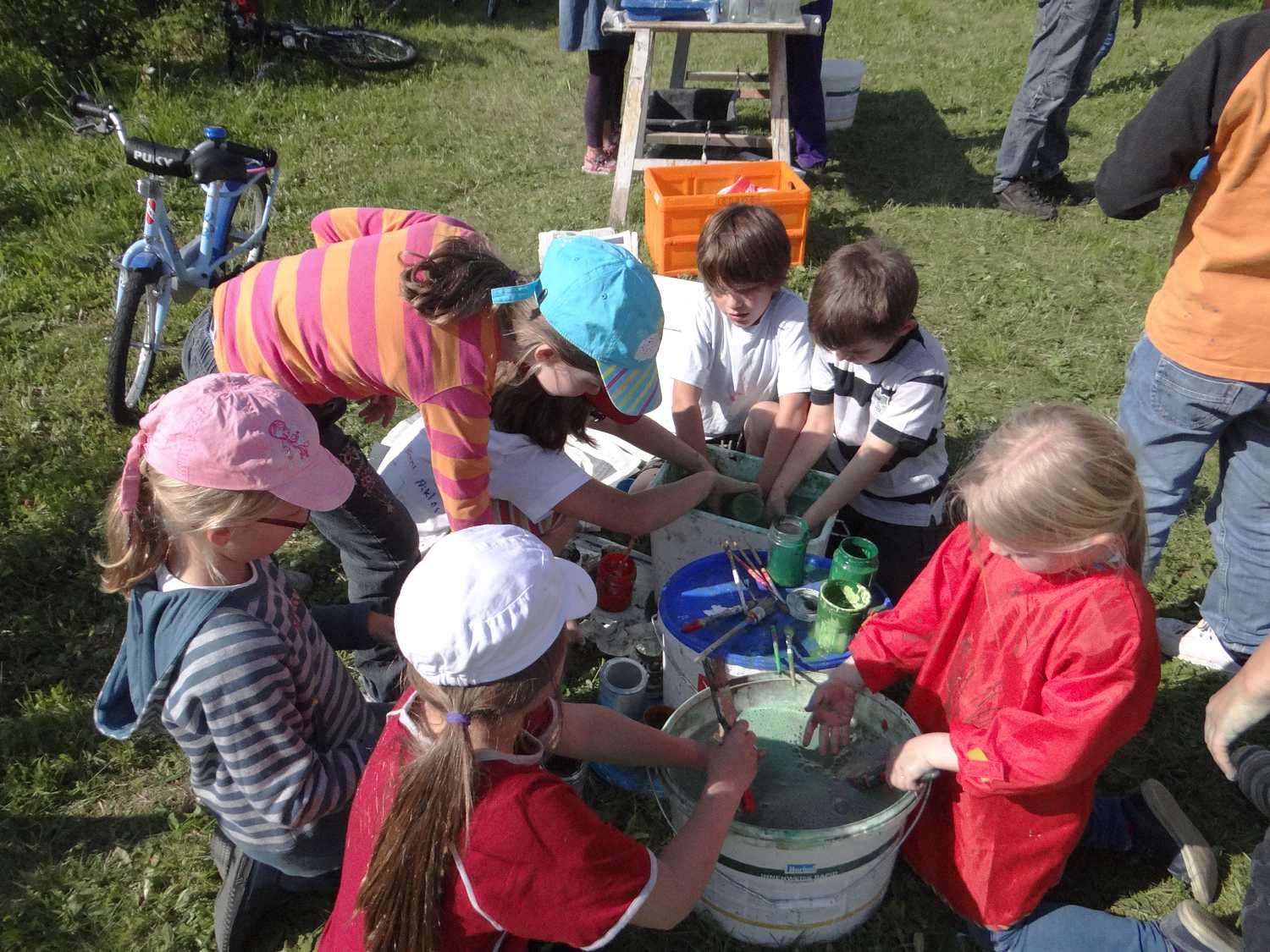 Praktische Hilfe und die nötige Portion Regie steuerten vier ehrenamtliche Helfer des Bund Naturschutz bei. Netterweise halfen auch einige Mütter mit: Ständig mussten Farben angerührt, abgefüllt oder Leitern gesichert werden.