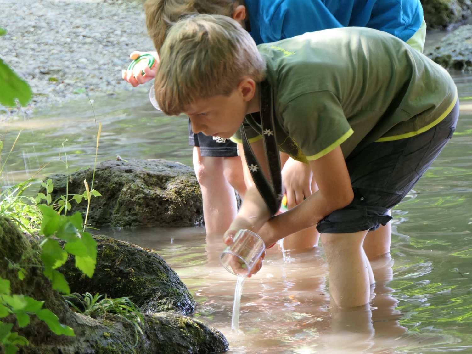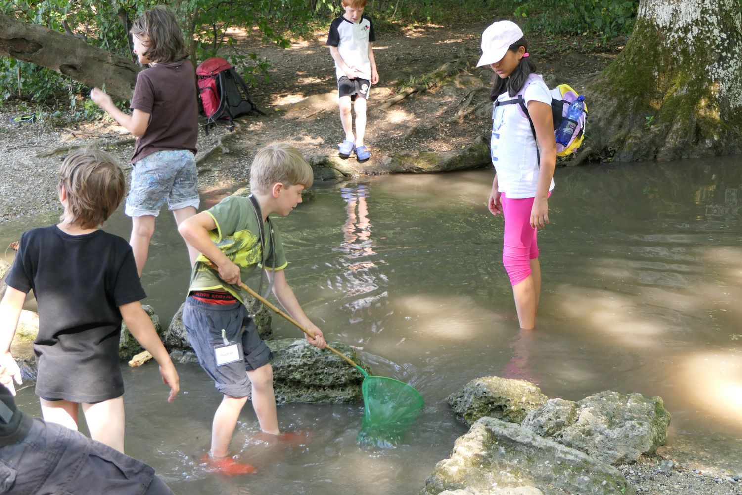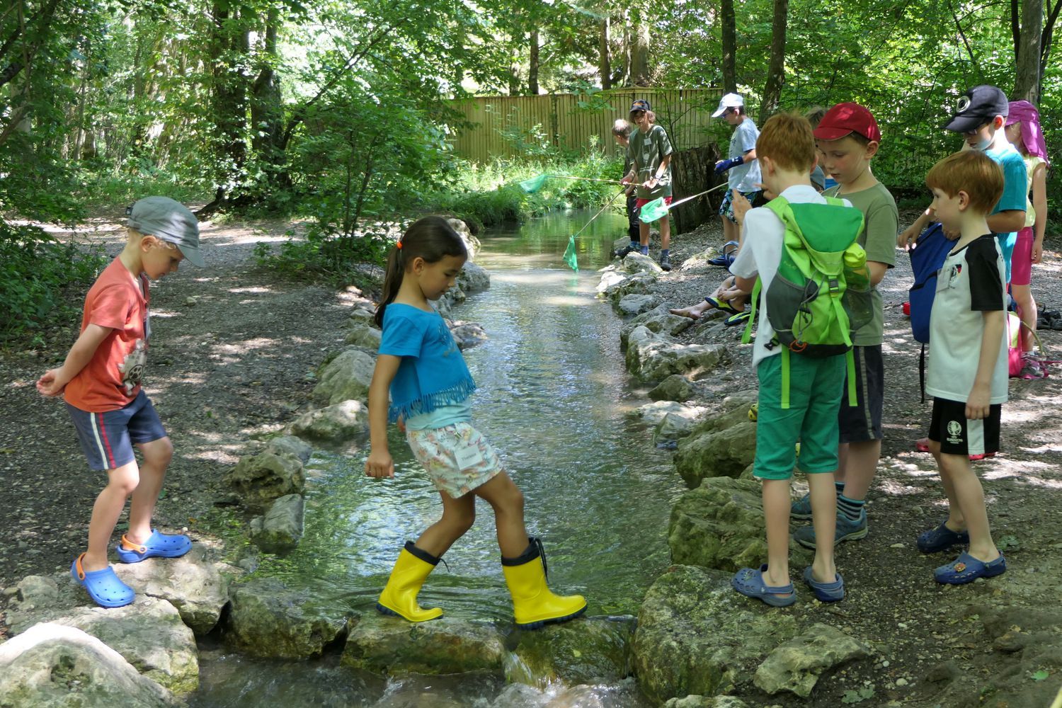 22.7.2017 - Am und im Berglbach gibt es für Berglfüchse immer etwas zum Entdecken. Darum sind sie diesmal von der Berglwirtschaft bis zur kleinen Brücke durch den gurgelnden Bach gestelzt. Dabei gab es ein Wettrennen aus selbst gebastelten Blätter-Booten. Wer etwas mehr Muße und Geduld hatte, konnte im Ufergeäst immer wieder gebänderte Prachtlibellen beim Sonnenbaden beobachten. An der Brücke wurde dann unsere mobile Forschungsstation aufgeschlagen. Unter den Stereolupen verwandelten sich Kleintiere wie Bachflohkrebse oder Wasserläufer in fantastische Fabelwesen. Sogar kleine Fische ließen sich mit Kescher und Becherlupe beobachten.