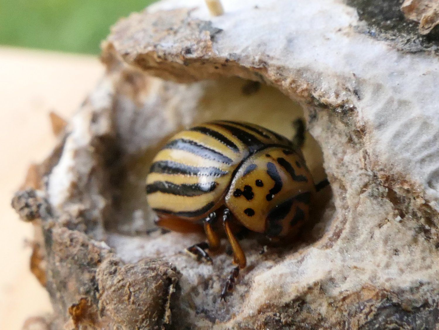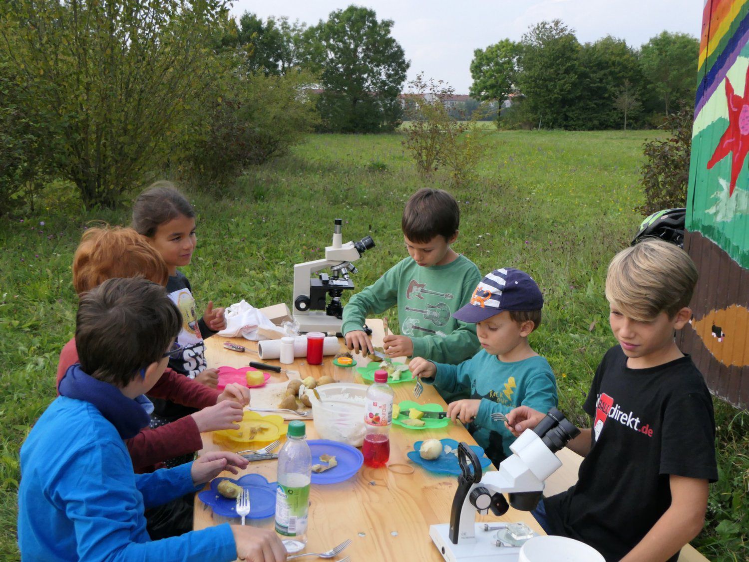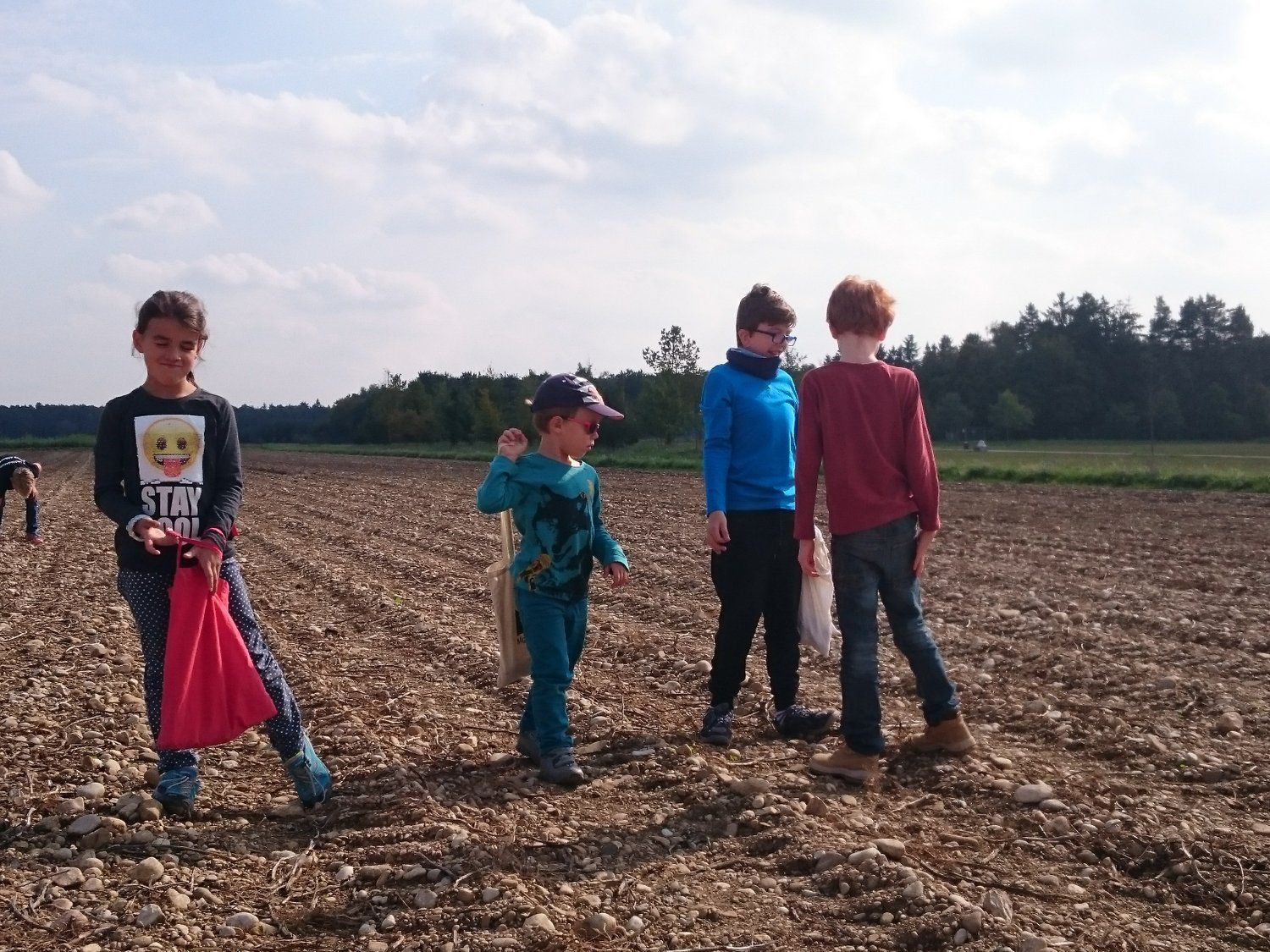 23.9.2017 - Im Spätsommer liegt auf den Äckern das Essen nur so herum. Gemeint sind die Reste der Kartoffelernte. Denn keine Erntemaschine hat so gute Augen wie die Berglfüchse. Darum haben wir einen Abstecher auf den Kartofellacker nebenan gemacht und Erdäpfel geklaubt. Damit daraus kein Klau wurde, mussten wir gut darauf achten, nur die abgeernteten Flächen abzusuchen. Was gar nicht so einfach ist, weil die Kartoffeln oft nur schwer von groben Kieselsteinen zu unterscheiden sind. Außerdem dürfen sie noch nicht zu lange offen am Licht gelegen haben, weil sie dadurch grün und giftig werden. Trotzdem konnten wir genug für eine leckere Brotzeit mit Kräutern und Quark sammeln. Zu den Tischgästen zählte auch ein Kartoffelkäfer, der unter der Stereolupe eine gute Figur machte.