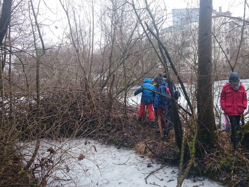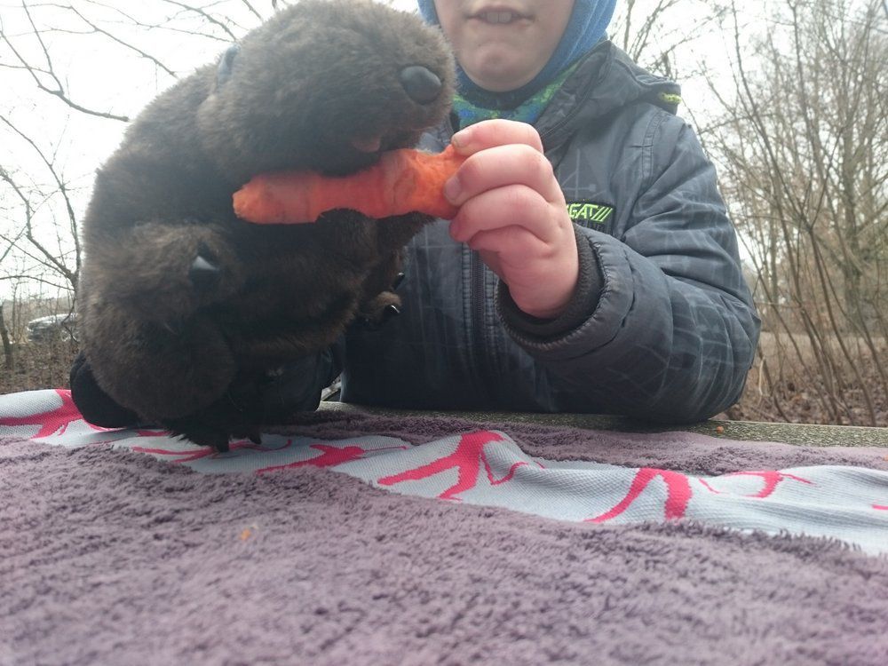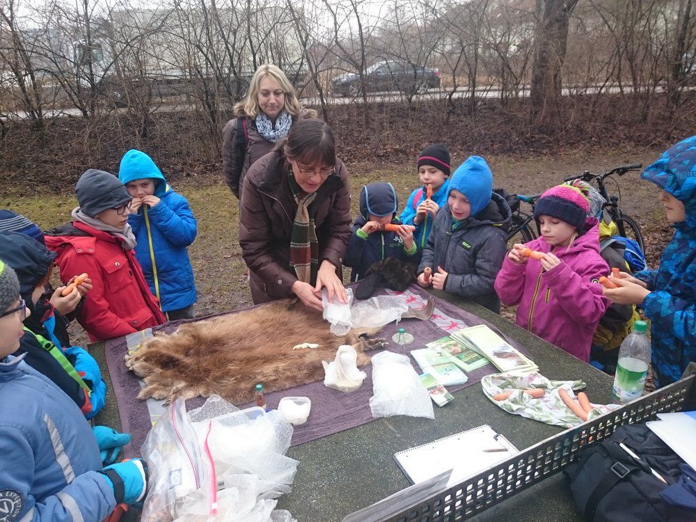 18.02.2017 - Mit vollem Rucksack besuchten wir wieder einmal die Biberburg am Weiher. Prall gefüllt war der Sack aber nicht mit Proviant, sondern mit allerlei interessanten Sachen über den Biber, zusammengestelt vom Bildungswerk des BN: Ein schönes weiches Biberfell, ein Schädel mit herausziehbaren kreisrund gekrümmten Nagezähnen und vielem mehr.