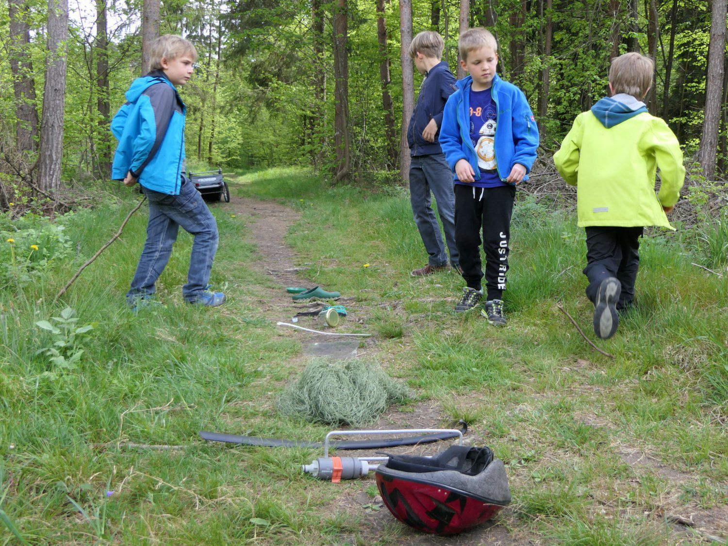 13.05.2017 - Heute mussten die Berglfüchse Trapper-Talent beweisen und Waldgeister aufspüren. Entlang eines 40 Meter langen Parcours waren 20 Gegenstände verteilt, die im Wald nichts zu suchen haben - vom Fahrradhelm über Schuhlöffel bis hin zu einer fast unsichtbaren Plexiglasplatte. Die bestgetarnten Geister waren aber ein dicker Kabelbinder, der sich als Splitter eines Baumstumpfes tarnte und ein Blumentopf mit Filzgräsern. Die größte Attraktion war, wie Magdalena, unsere Eidechsen-Expertin, eine Zauneidechse geschickt von einer Zecke befreite.