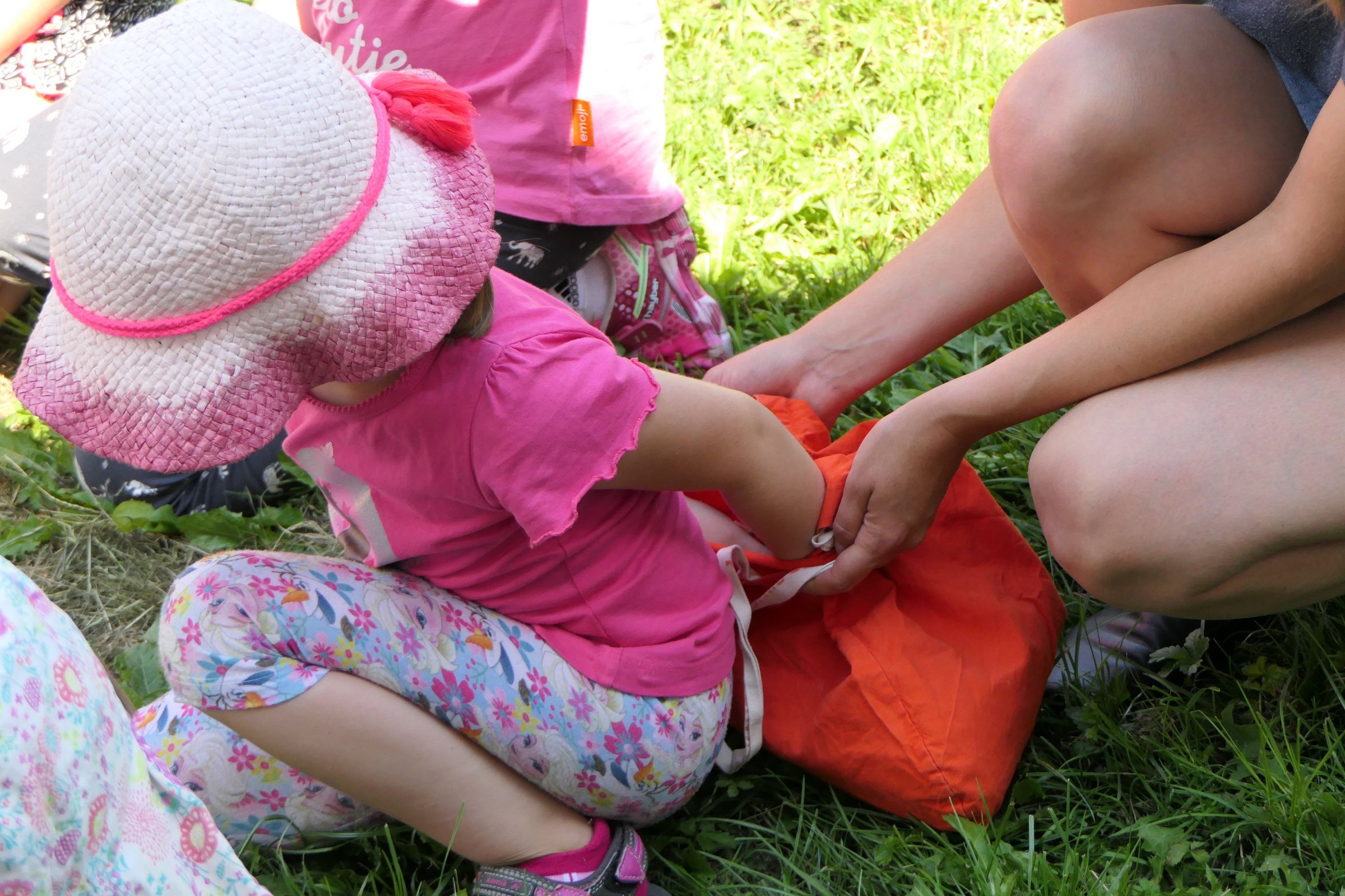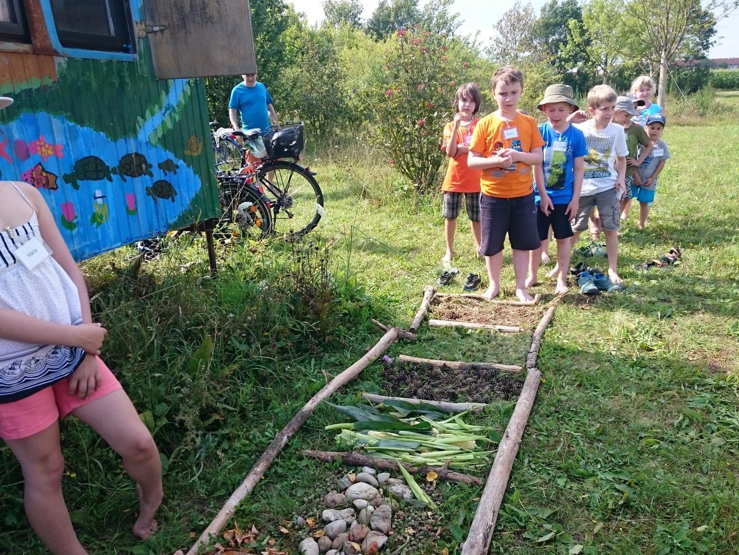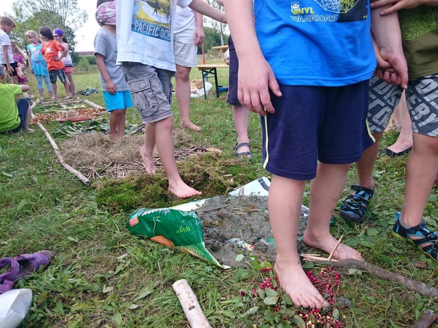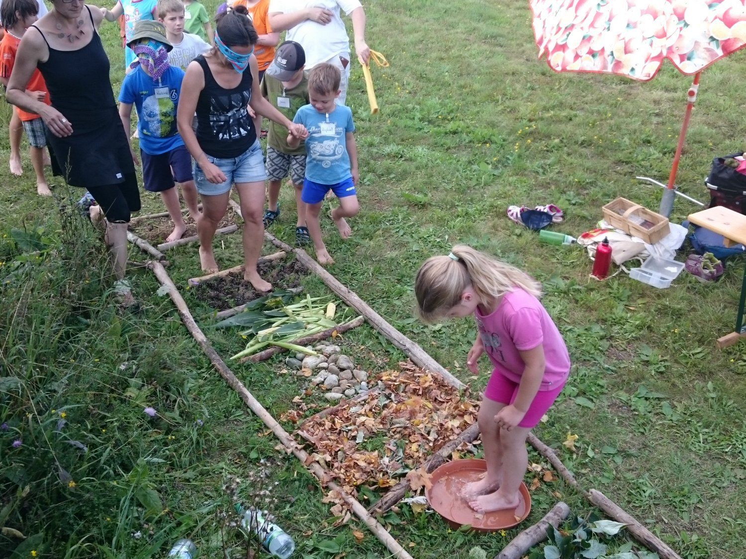 28.07.2018 - An den Fußsohlen haben wir ähnlich viele und ählich feinsinnige Nerven wie an den Händen. So können sie viel wahrnehmen und erleben - wenn wir sie nicht immer so dick einpacken würden. Bei unserem heutigen Treffen gaben wir ihnen die Freiheit zurück - und viel zum Fühlen und Erspüren. Im Schatten des Bauwagens bauten wir einen Barfuß-Pfad mit allem was wir an und im Wald finden konnten. Besonders beliebt war der überraschend weiche Teppich aus den Früchten der filzigen Klette. Auch die Eltern, die heute etwas früher und auf einen Ferienanfangs-Kaffee gekommen waren, durften die Weisheit ihrer Fußsohlen auf die Probe stellen.