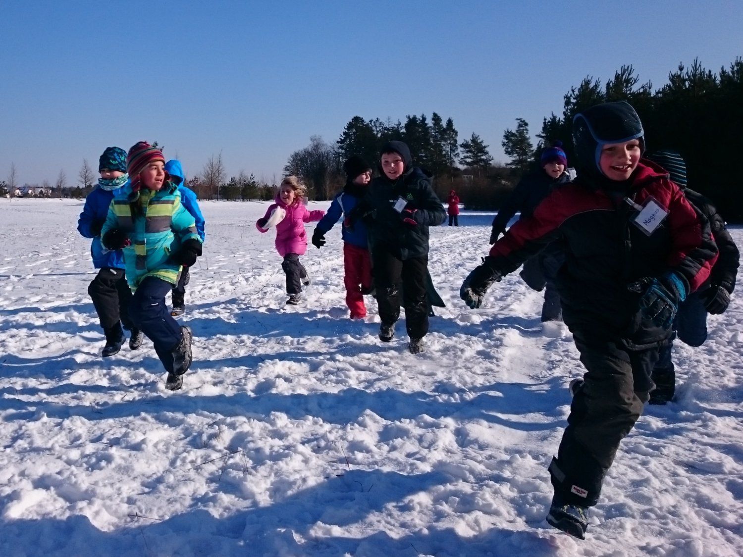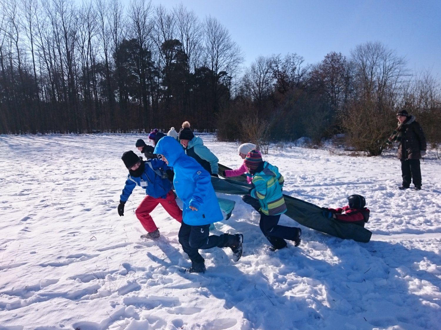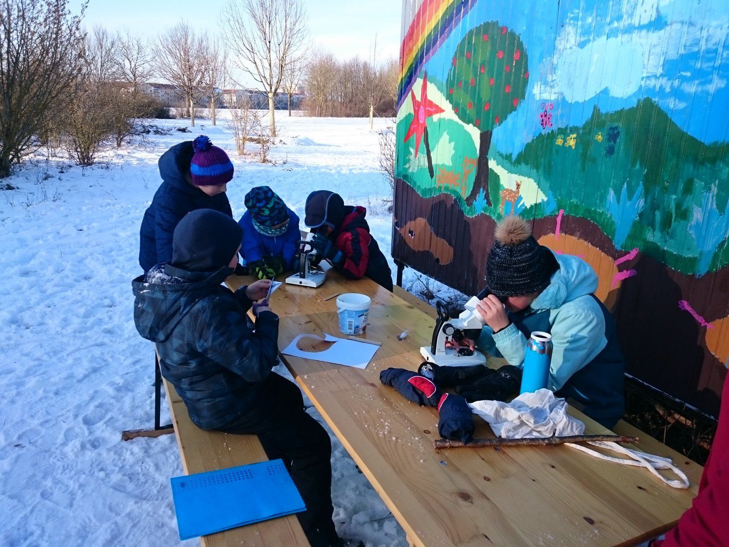 24.02.2018 - Schnee ist nicht nur in den Bergen ein Erlebnis. Bei klirrender Kälte und steifem Ostwind gab es diesmal eine Planen-Rallye: Zwei Teams traten an, bestimmten jeweils ein Kind als Jockey auf der Plane und galoppierten los. Im geheizten Bauwagen tranken wir heißen Tee und bastelten Schneeflocken aus Papier. Die unerschrockensten Forscher trotzten der Kälte aber noch weiter und bewunderten die Vielfalt der Schneekristalle unterm Mikroskop.