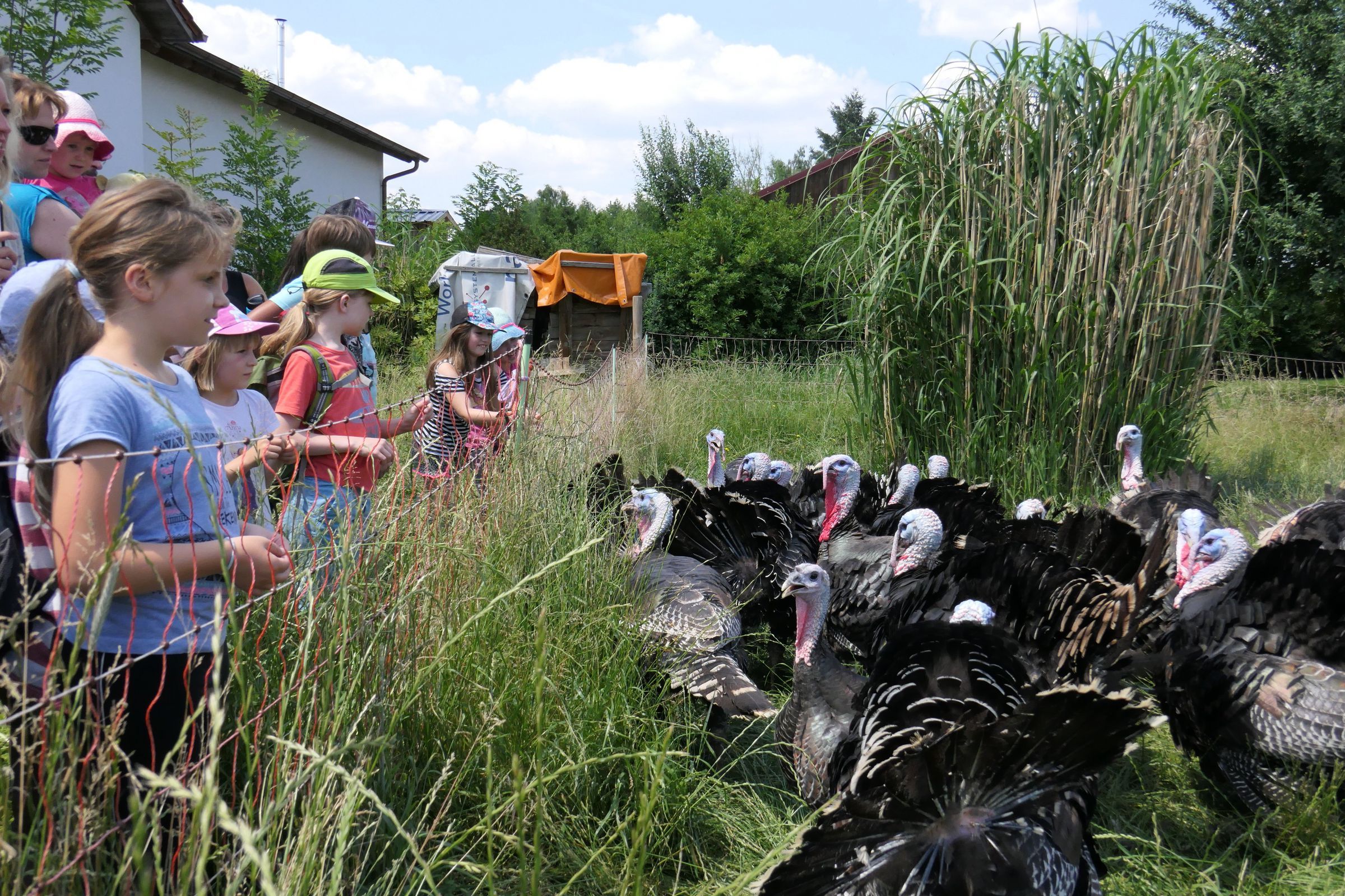 16.06.2018 - Wie funktioniert eigentlich ein Bio-Bauernhof? Und wer oder was lebt da so alles? Das haben wir uns einmal aus der Nähe angesehen. Wir besuchten den Hof der Familie Pflügler in Großnöbach, die dort unter anderem Freiland-Bioputen halten. Anja zeigte uns den ganzen Hof und vor allem die riesigen Hühnervögel. Sie beeindruckten vor allem mit ihrem dunkel schillernden Federkleid und ihren wundersamen Runzeln und Fleischlappen. Es ist eine spezielle Rasse, die anders als üblich besonders langsam wächst.