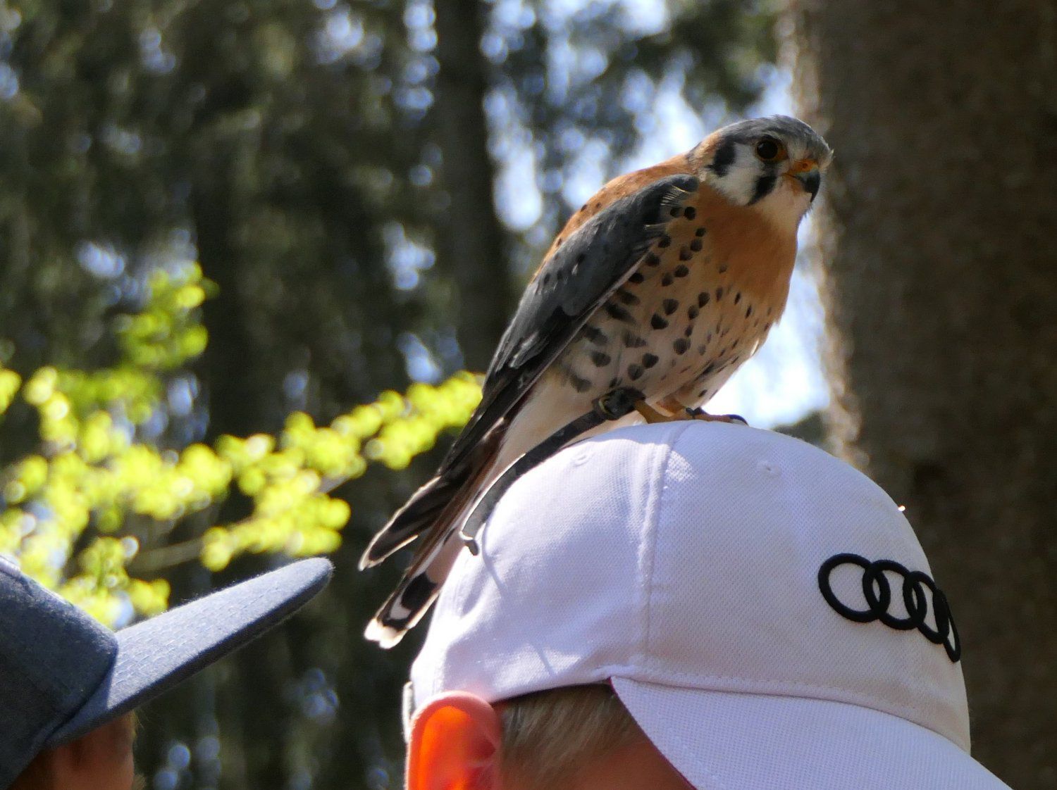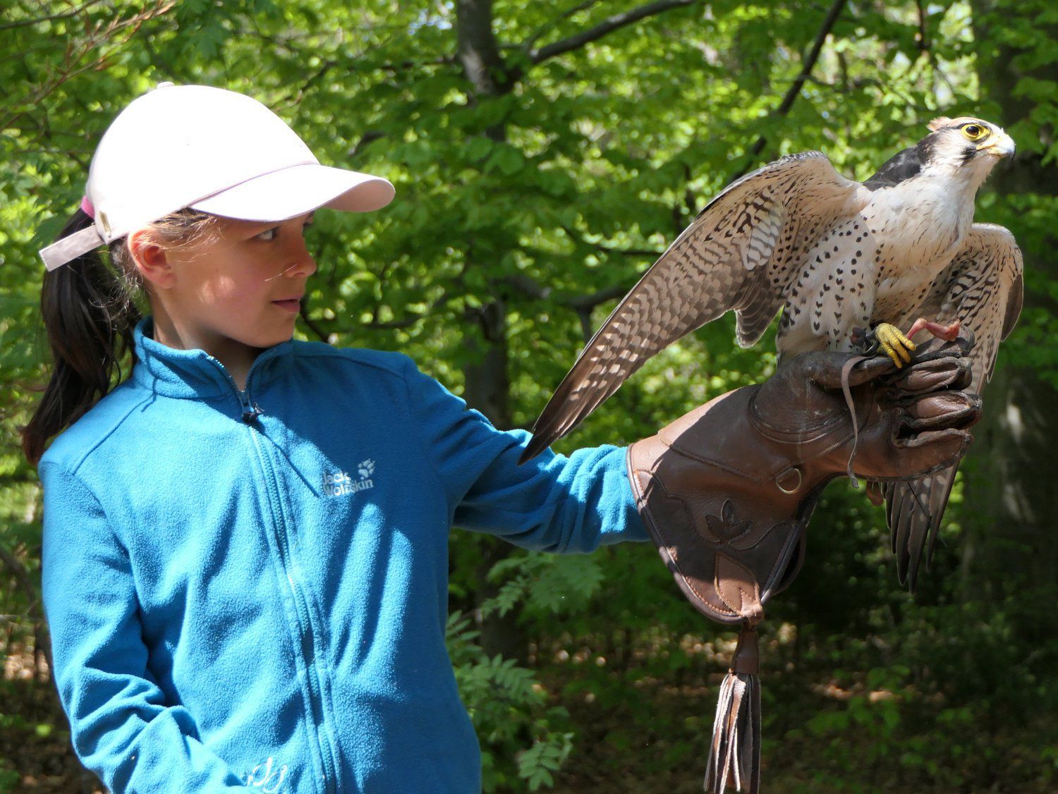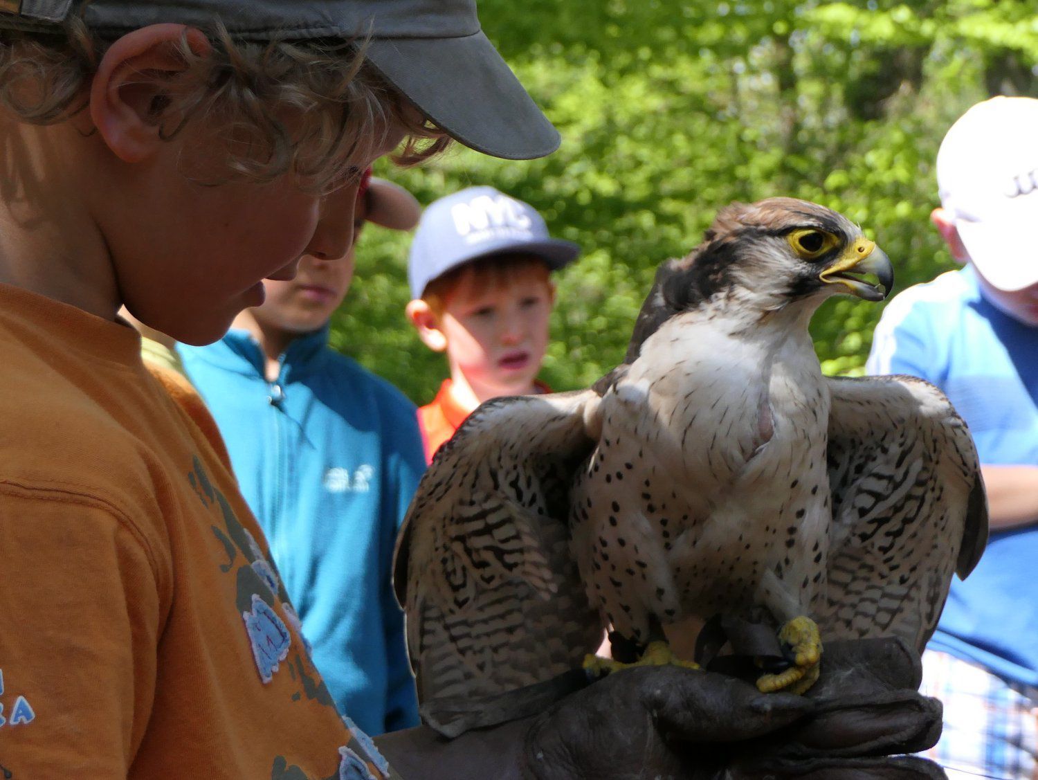 28.04.2018 - Einen spannenden Vormittag hatten wir diesmal mit dem Falkner Wolfgang Schreyer aus Unterschleißheim. Er kennt Greifvögel und ihre Lebensweise wie kaum ein anderer in Bayern und ist intensiv in der Umweltbildung aktiv. Im Berglwald hat er dazu eigens ein grünes Klassenzimmer eingerichtet. Von dort aus ging's zunächst auf Schnitzeljagd, bei der wir typische Waldtiere erraten mussten. Dazu hatte Herr Schreyer in der Nähe des Wegs lebensecht ausgestopfte Tierbälge mehr oder weniger gut versteckt, darunter ein Fuchs, ein Wildschwein, ein Feldhase und andere mehr. Am eindrucksvollsten waren freilich die stolzen Greifvögel. Gut erzogen und gut mit Hühnerbeinen gefüttert ließen sie alles mögliche mit sich machen...