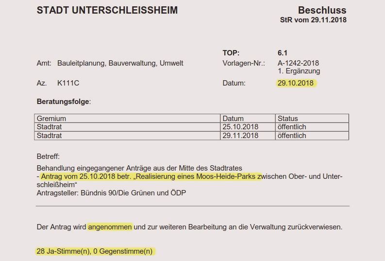 29.11.2018 - Heute wurde der Antrag von Bündnis90/Die Grünen und ÖDP, den Moos-Haide-Park in Angriff zu nehmen, vom Stadtrat Unterschleißheim einstimmig angenommen! Grundlage dafür solle der Vorschlag sein, den die BN-Ortsgruppe 2016 vorgelegt hatte.